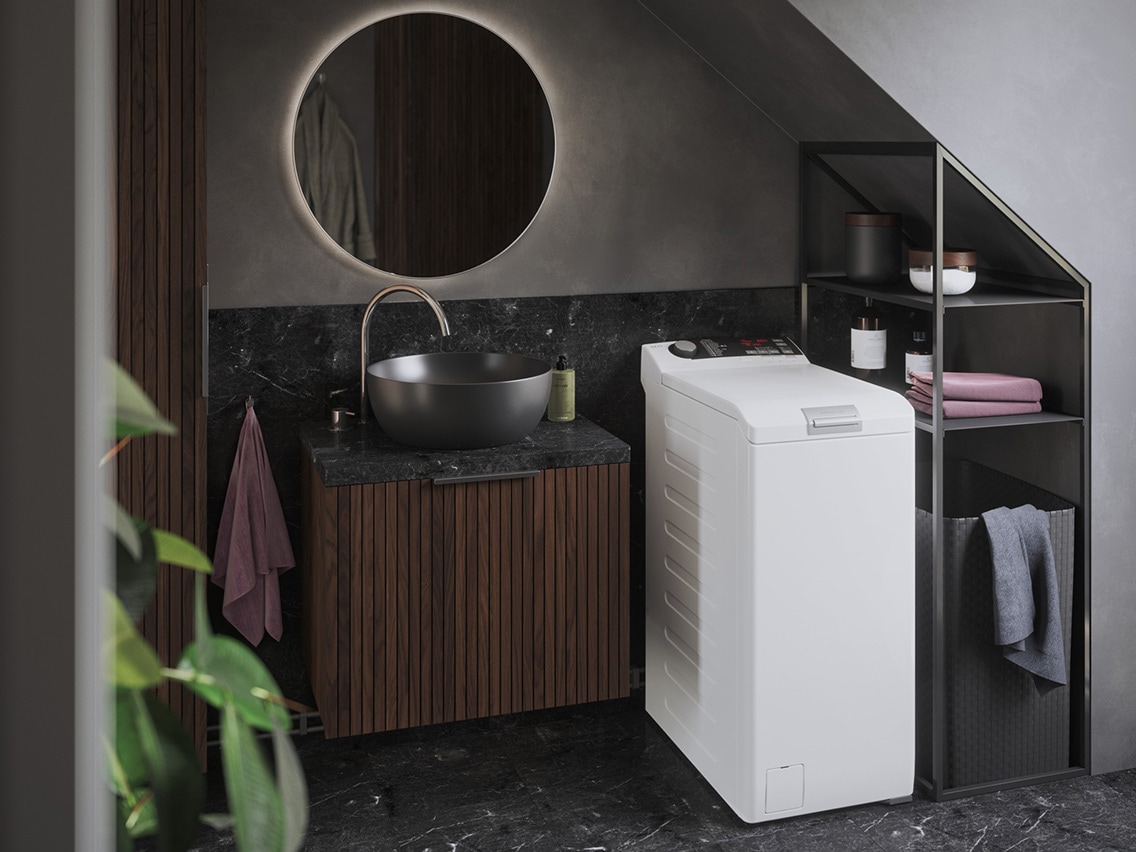 En topbetjent vaskemaskine er smal og pladsbesparende, og det gør den perfekt til et lille badeværelse eller bryggers. Lågen foroven gør det nemt at fylde og tømme maskinen, uden at du behøver at bøje dig ned.