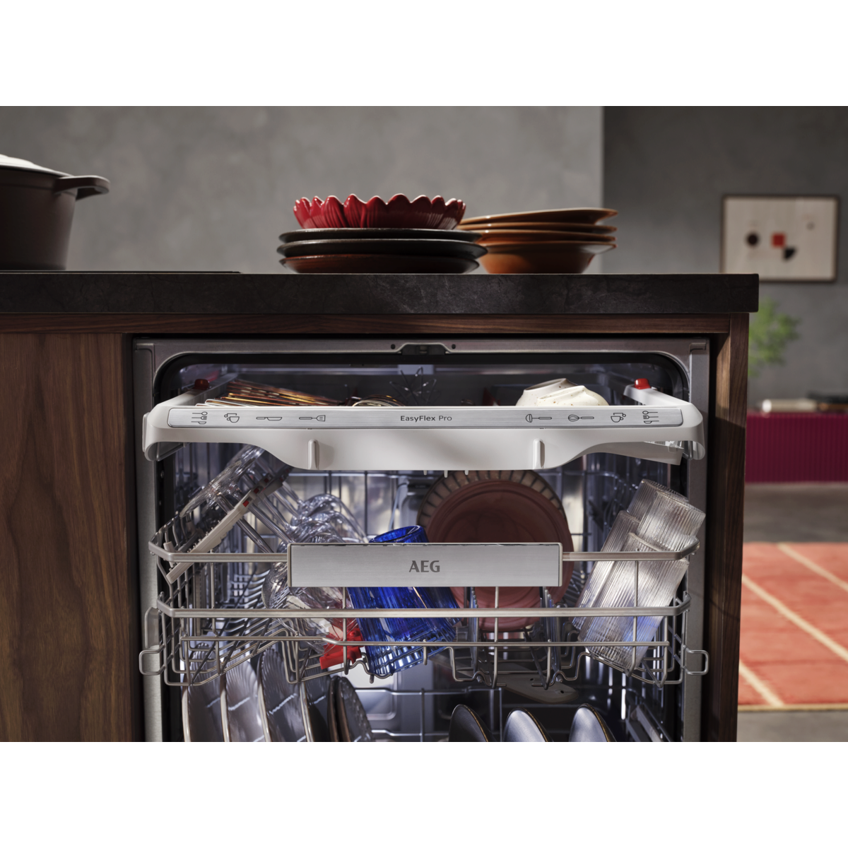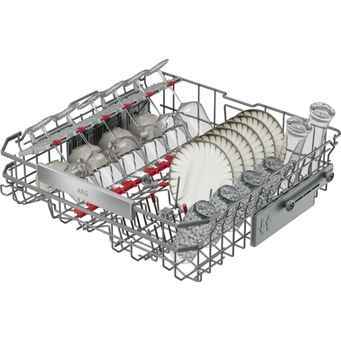XXL kapacitet, multifunktionelle kurve. Uovertruffen, effektiv rengøring. 9000 XXL: 5 cm højere indeni, men passer under et køkkenbord i standardhøjde. Multifunktionelle kurve med holdere til glas og bakker. Kraftfuld rengøring fjerner fastbrændte madrester. Højeffektivt vandsystem bruger helt ned til 8,4 liter vand pr. opvask.