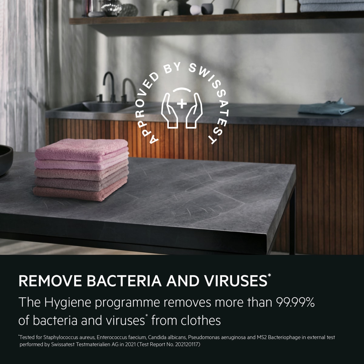 *Testet for Staphylococcus aureus, Enterococcus faecium, Candida albicans, Pseudomonas aeruginosa og MS2 Bacteriophage i ekstern test udført af Swissatest Testmaterialien AG i 2021 (testrapport nr. 202120117)